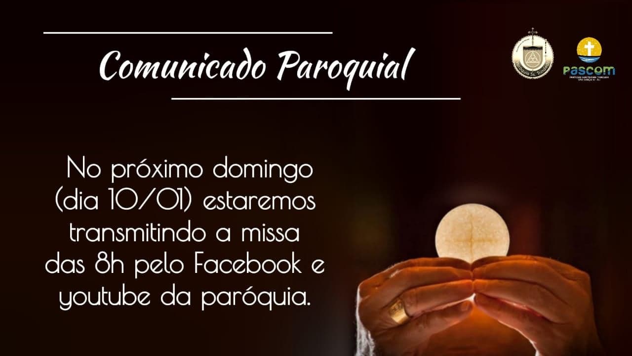 Desta forma você, paroquiano e visitante, poderá assistir de sua casa a transmissão da Santa Missa, dia 10 de Janeiro, às 08h, pelo Facebook e/ou YouTube da Paróquia.